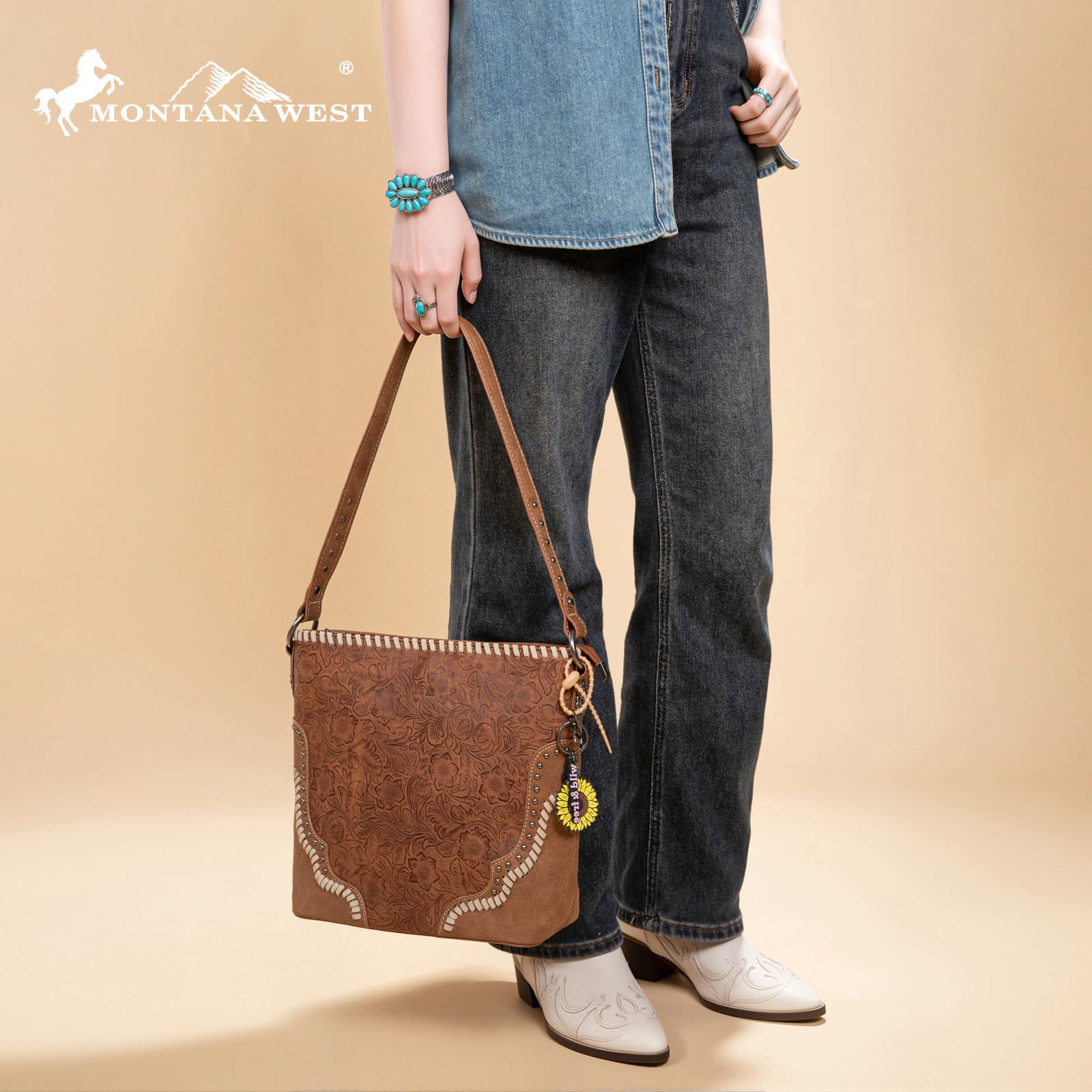 - Floral tooled with whipstitch detail and antique silver embellishments on the front of the women hobo bag
