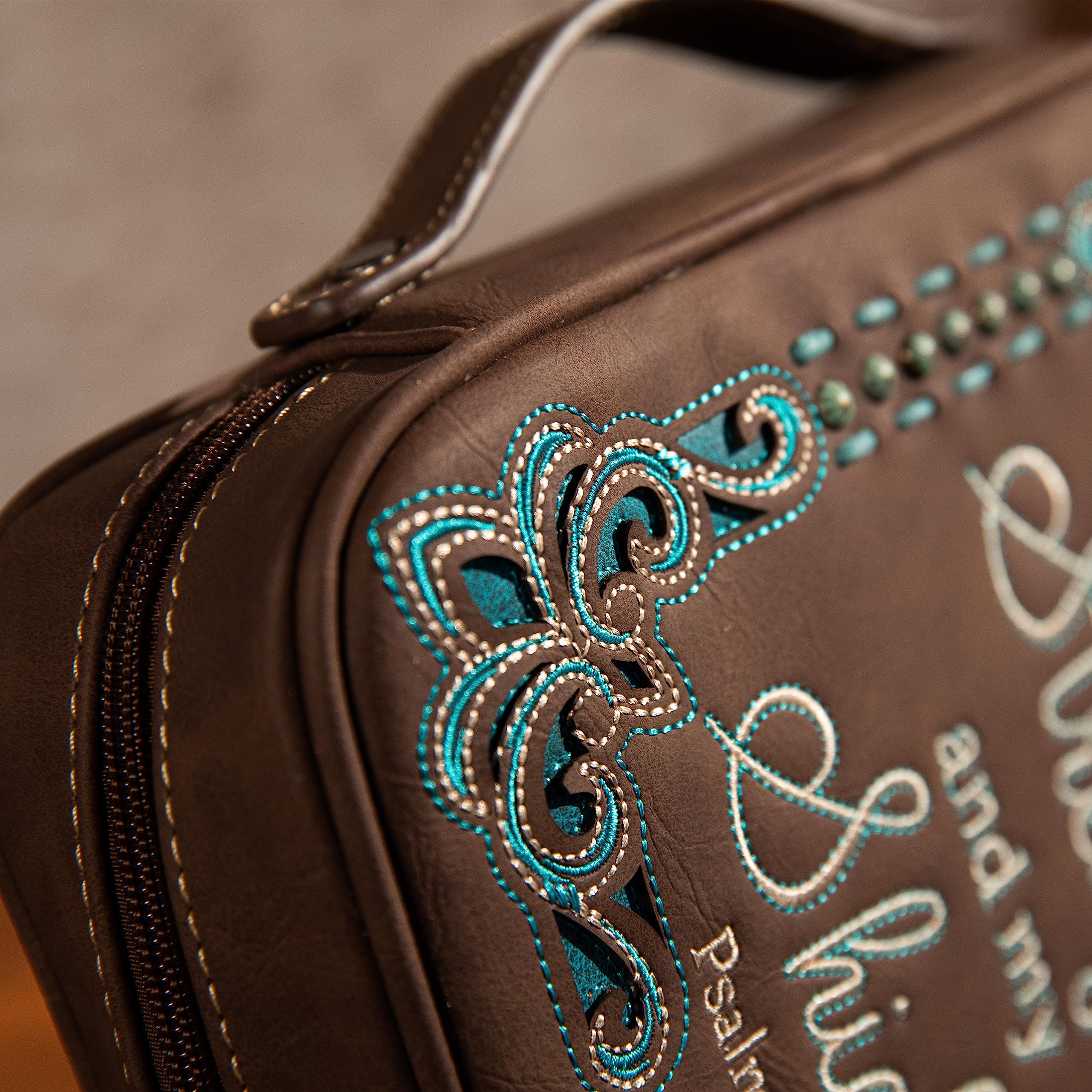 - Our bible cover is embroidered some words and floral embroidery in front of the bag. A scallop trip and silver stud detail were added. Beautifully crafted to protect your bible through time