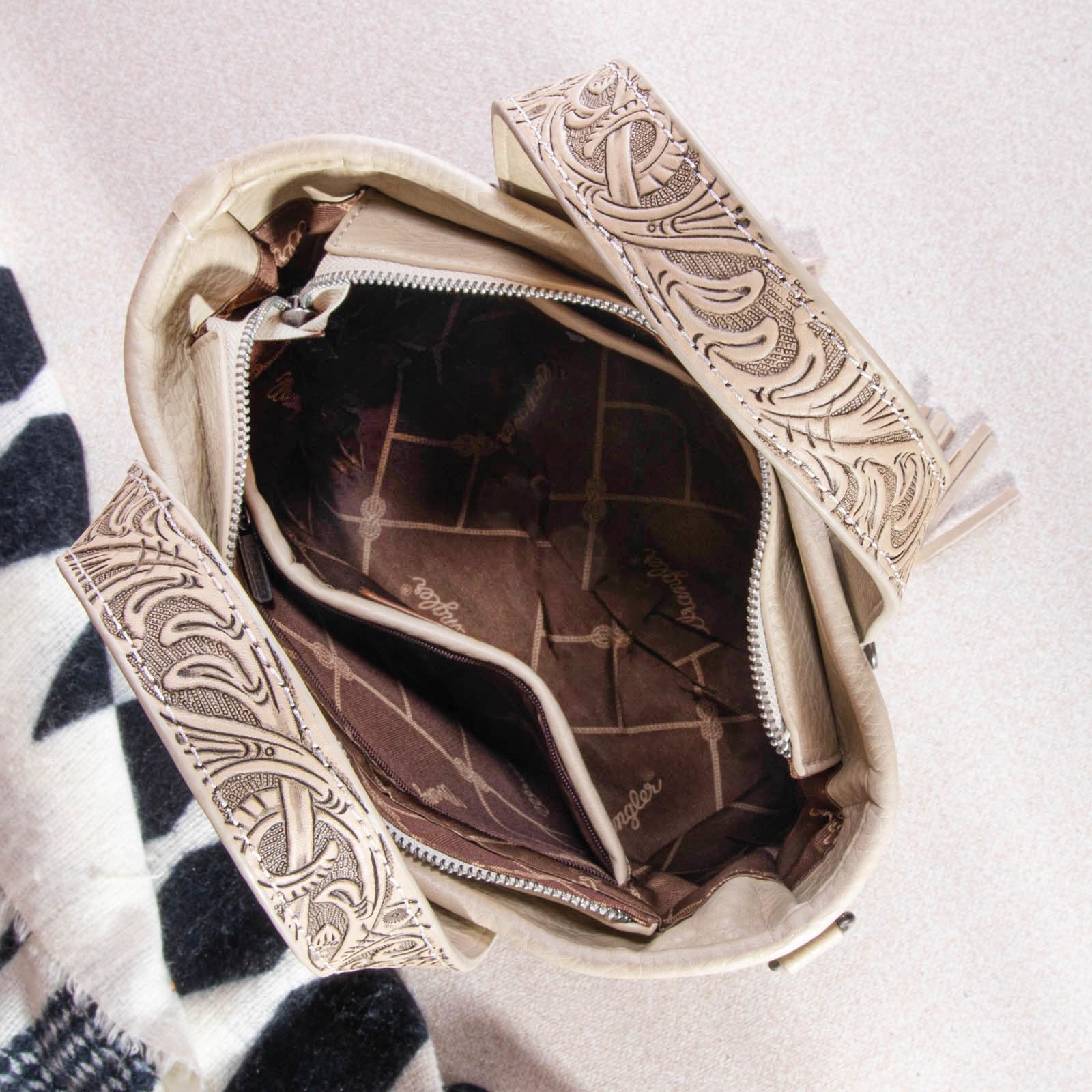 - Wrangler western tote bag combined with horsehair design and vintage floral tooling.