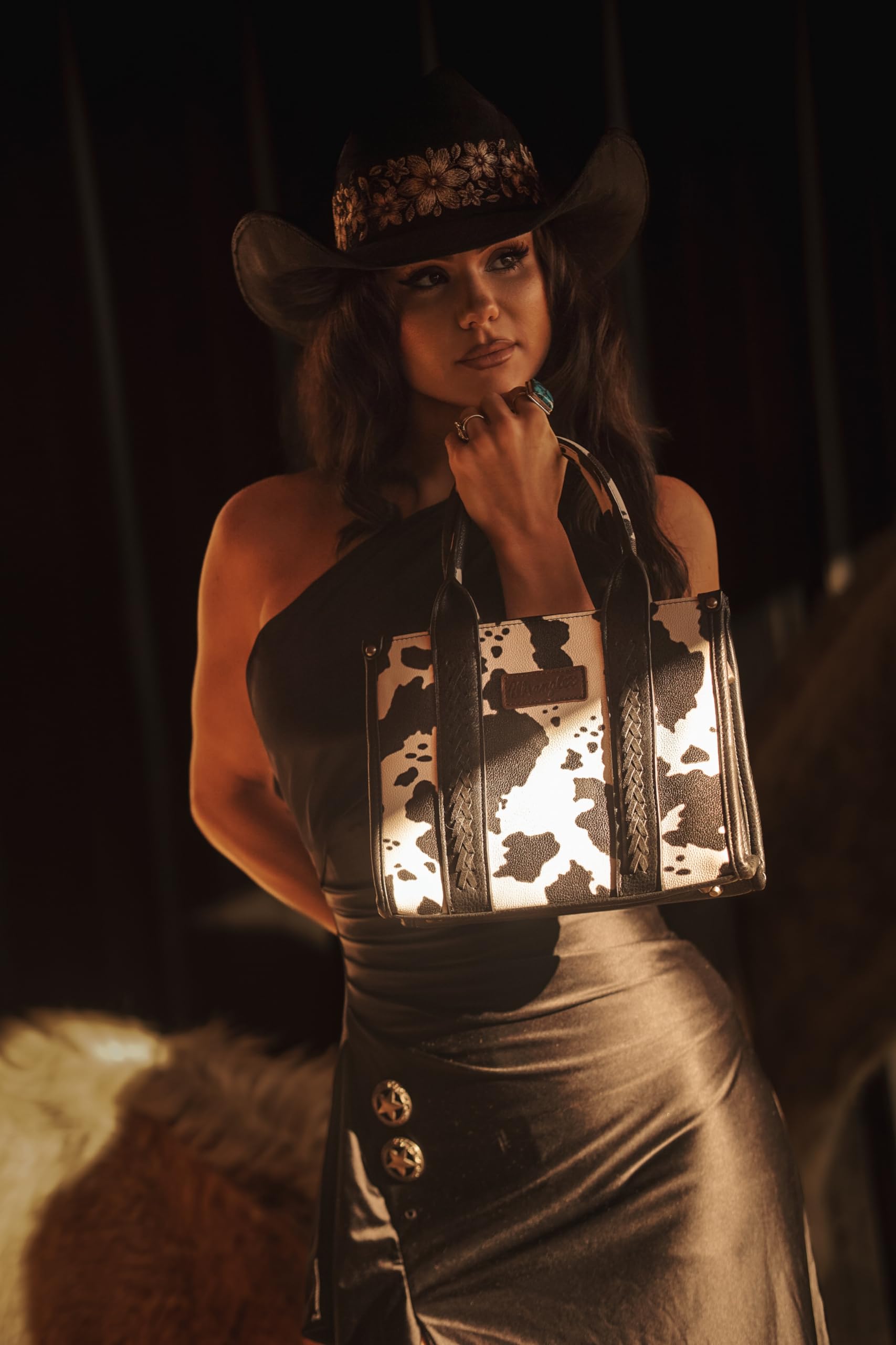 - From the eye-catching cow print to the cross-stitch woven details, Wrangler tote will be your next everyday purse.